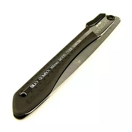 Пила складная Silky Saw GOMBOY 270 мм 10 зубьев на 30 мм чёрная рукоять 121-27 - прочный и компактный походный инструмент, для средних веток и стволов. В лесу Вы быстро напилите дров, на даче - уберёте ненужные ветки с садовых деревьев. Толщина полотна 0,7 мм., ширина полотна 40 мм.Конусная форма лезвия сводит на минимум трение и дает возможность сделать зуб пилы без разводки, это обеспечивает тонкий распил, что в свою очередь позволяет прилагать меньше усилий. Вы сможете пилить и в поперечном направлении, и в продольном, и по диагонали.Прочная и не скользящая, прорезиненная рукоять из алюминиевого сплава обладает фиксацией в двух положениях для удобства распила в труднодоступных местах. Зонная закалка полотна пилы позволяет там, где необходимо (в зоне зубьев) сохранять надолго остроту, а само полотно не закалённое и, поэтому, гибкое и не хрупкое.